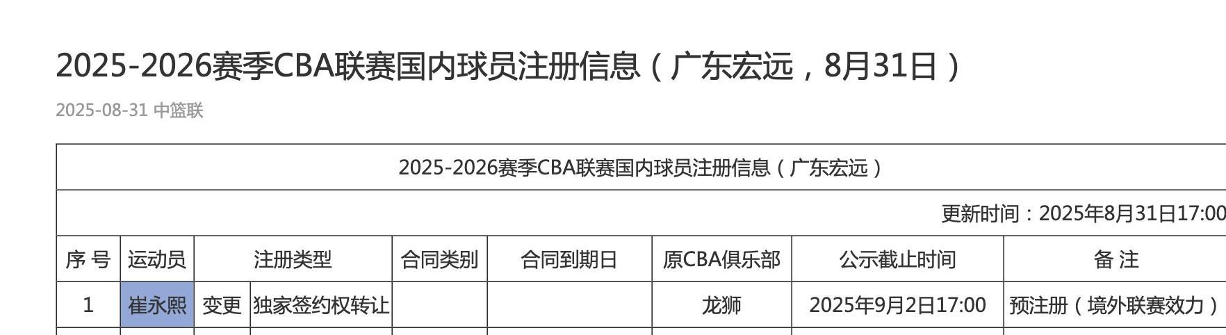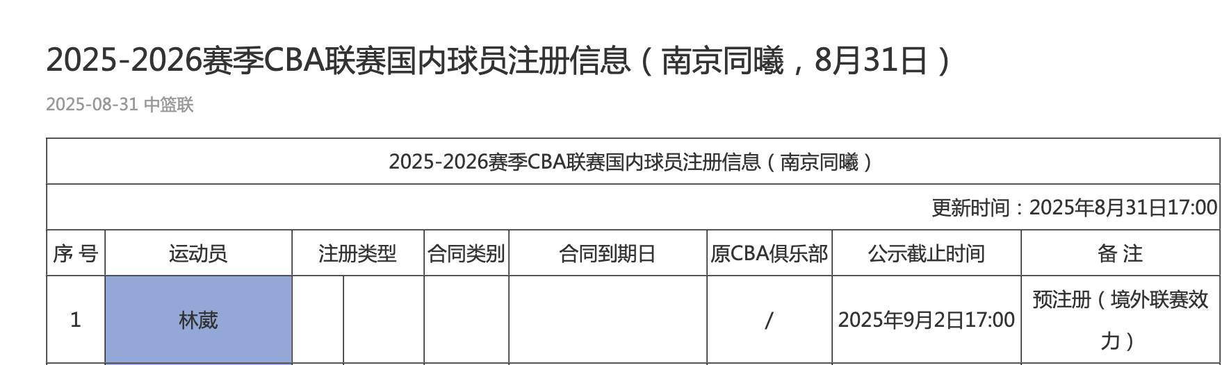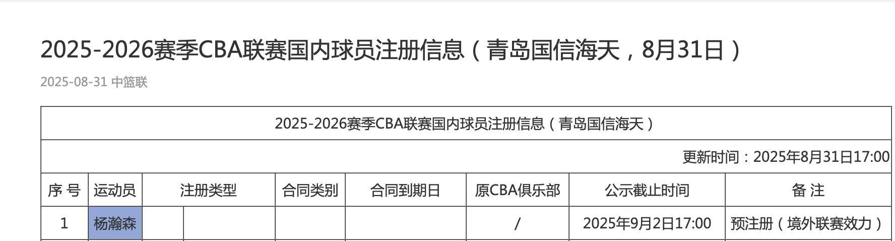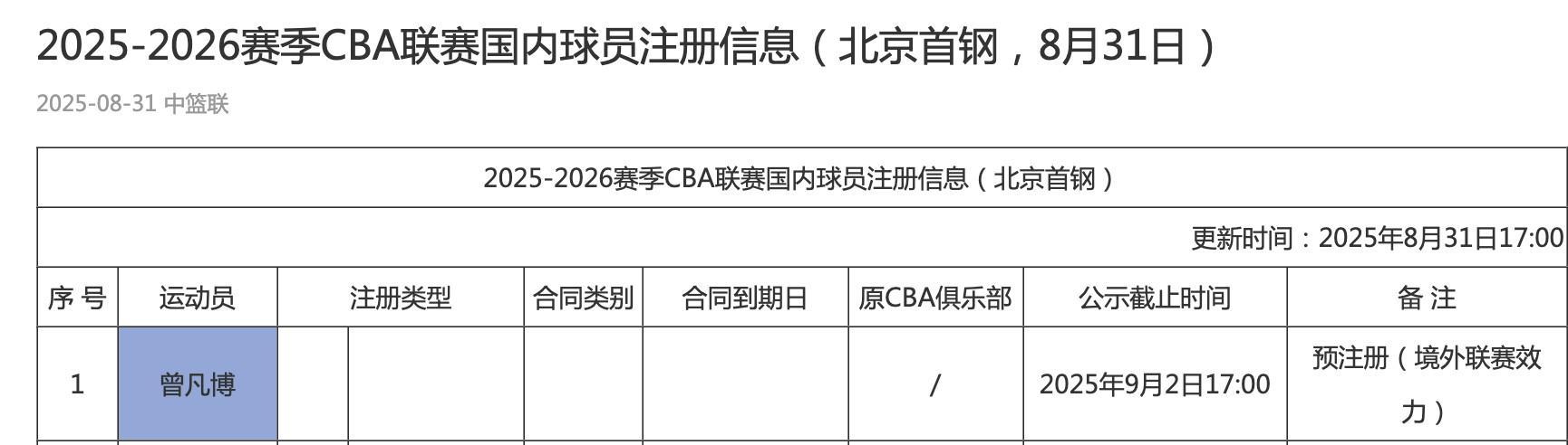 北京时间8月31日,CBA官方更新了各队国内球员注册信息,目前在海外打球的曾凡博、崔永熙、杨瀚森、林葳四名球员均完成了预注册。