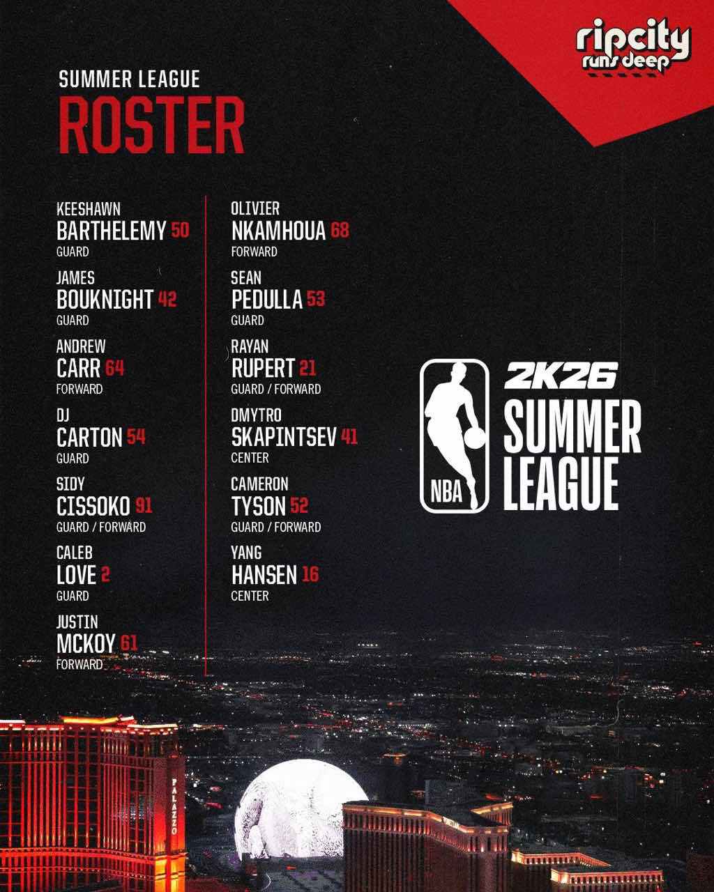另外这份名单还有像鲁珀特,凯莱布·乐福这样的球员。开拓者主帅比卢普斯则将亲自挂帅,他们将在7月12日首战对阵勇士。